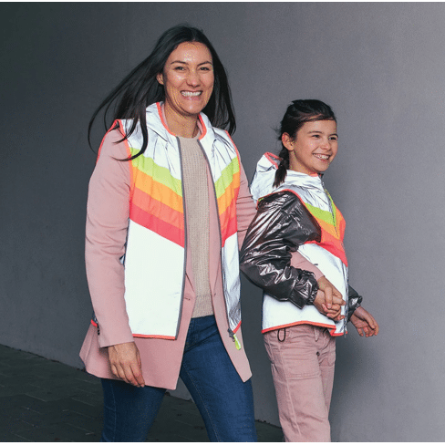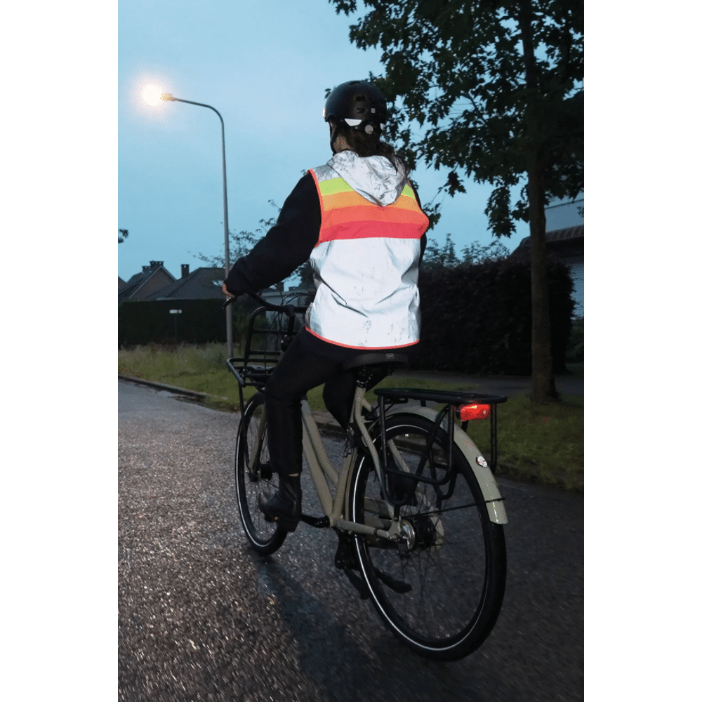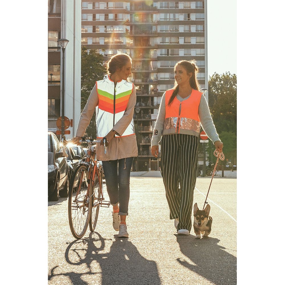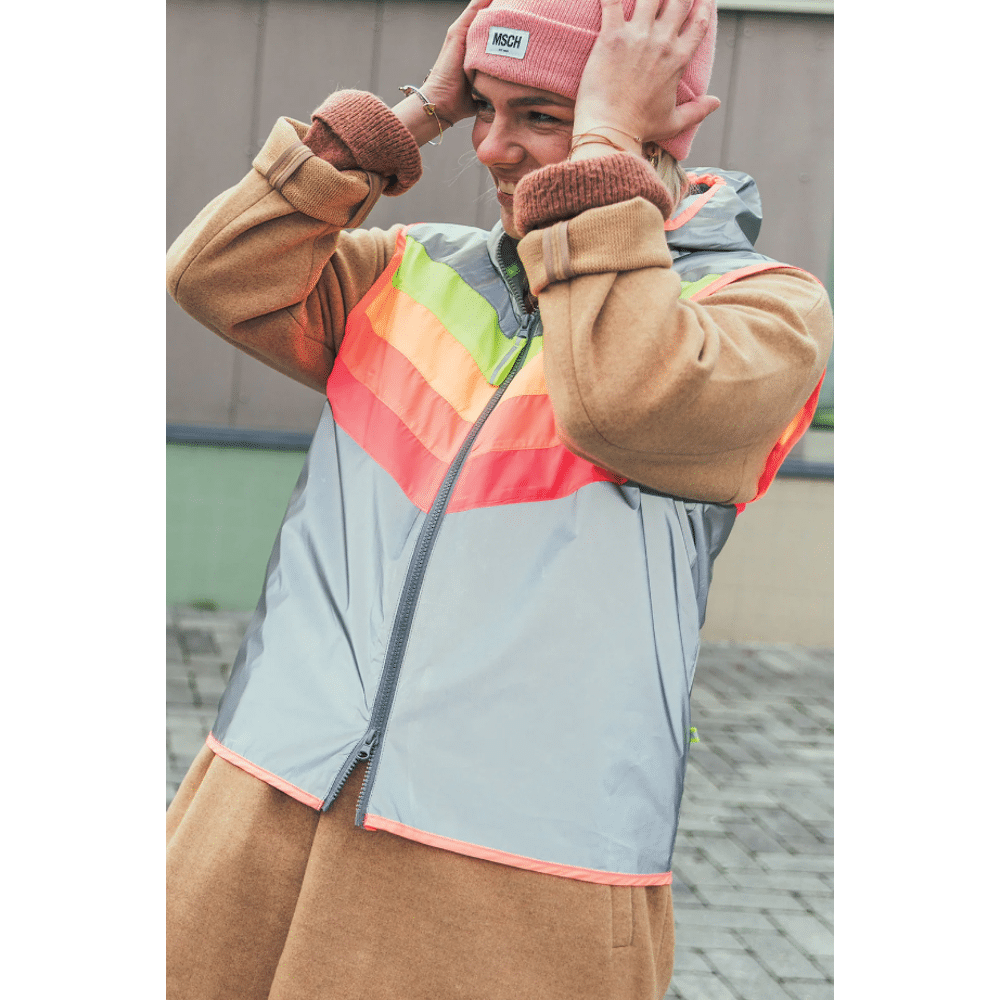 straal in een vrolijke bodyglower en maak je voorbijgangers goed gezind! de reflecterende stof maakt jou extra zichtbaar in het donker, terwijl de fluo regenboogkleuren je overdag in de spotlight zetten.