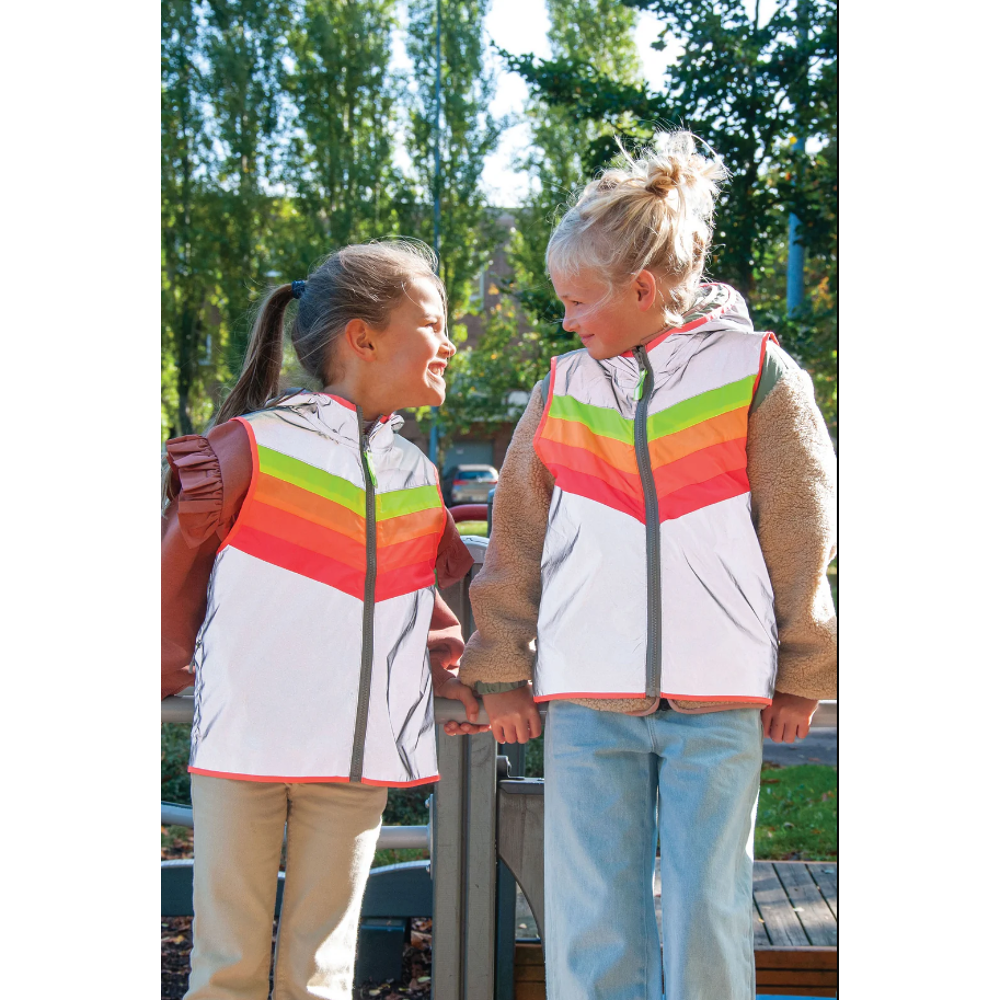 de fluo regenboogkleuren & koraalkleurige rand aan de zoom laten je kids overdag stralen. de reflecterende stof houdt hen extra goed zichtbaar in het donker. de achterkant van dit fluohesje valt ietsje langer waardoor het perfect aansluit aan je rug tijdens het fietsen. in de zijnaden vind je een zakjes met verborgen rits.