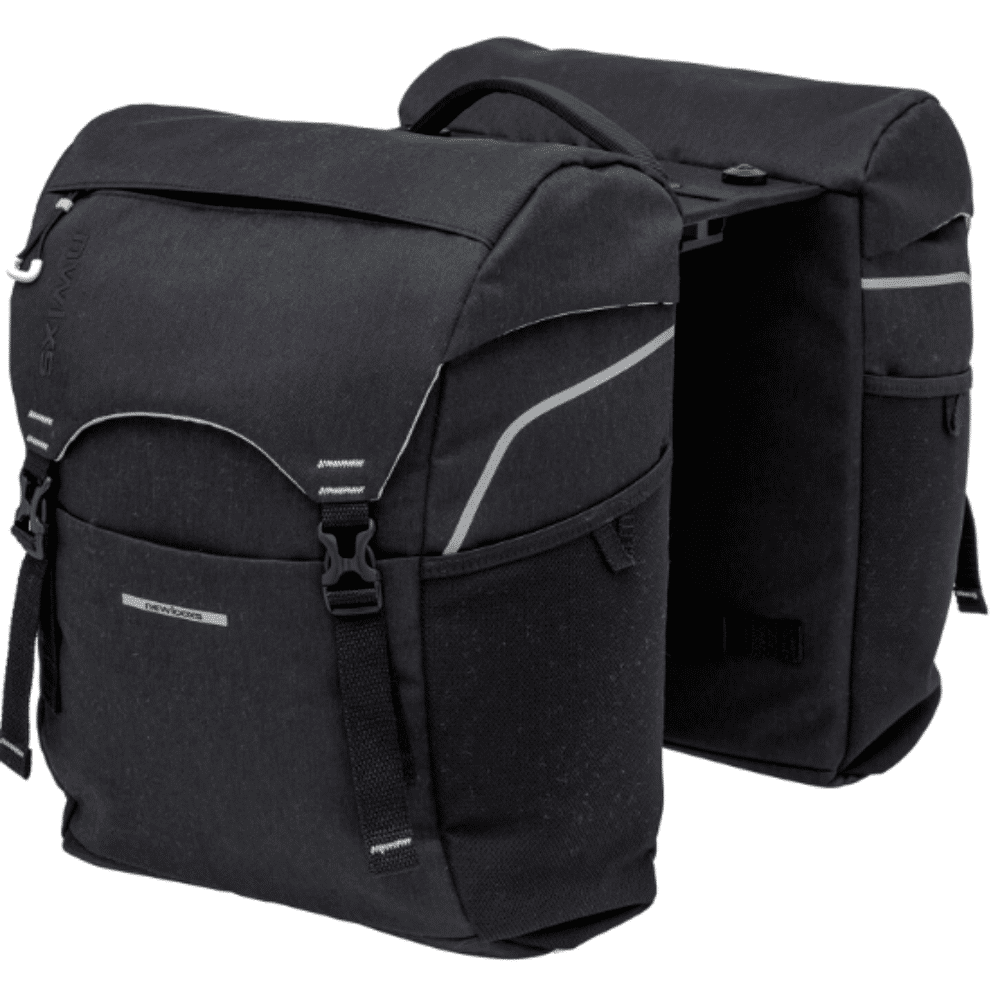 Heb je vragen over dit product of krijg je graag nog wat advies voor je besteld. Stel hier je vraag.De Sports Double is een sportieve dubbele fietstas, gemaakt van waterafstotend polyester. Deze tas is speciaal gemaakt voor MIK bagagedragers. De bijbehorende regenhoes beschermt jouw spullen tegen een flinke regenbui. De tas heeft een handzaam formaat. Naast de ruime hoofdvakken beschikt hij over veel handige extra vakjes. Dit maakt deze fietstas geschikt om boodschappen mee te doen, naar werk te fietsen of gewoon een recreatief ritje te maken. De tas is stevig en vormvast door de kunststof platen in de bodem en achterwand en de extra versteviging door middel van foam. Zo blijft deze sportieve tas goed in vorm en stop je er makkelijk je spullen in.